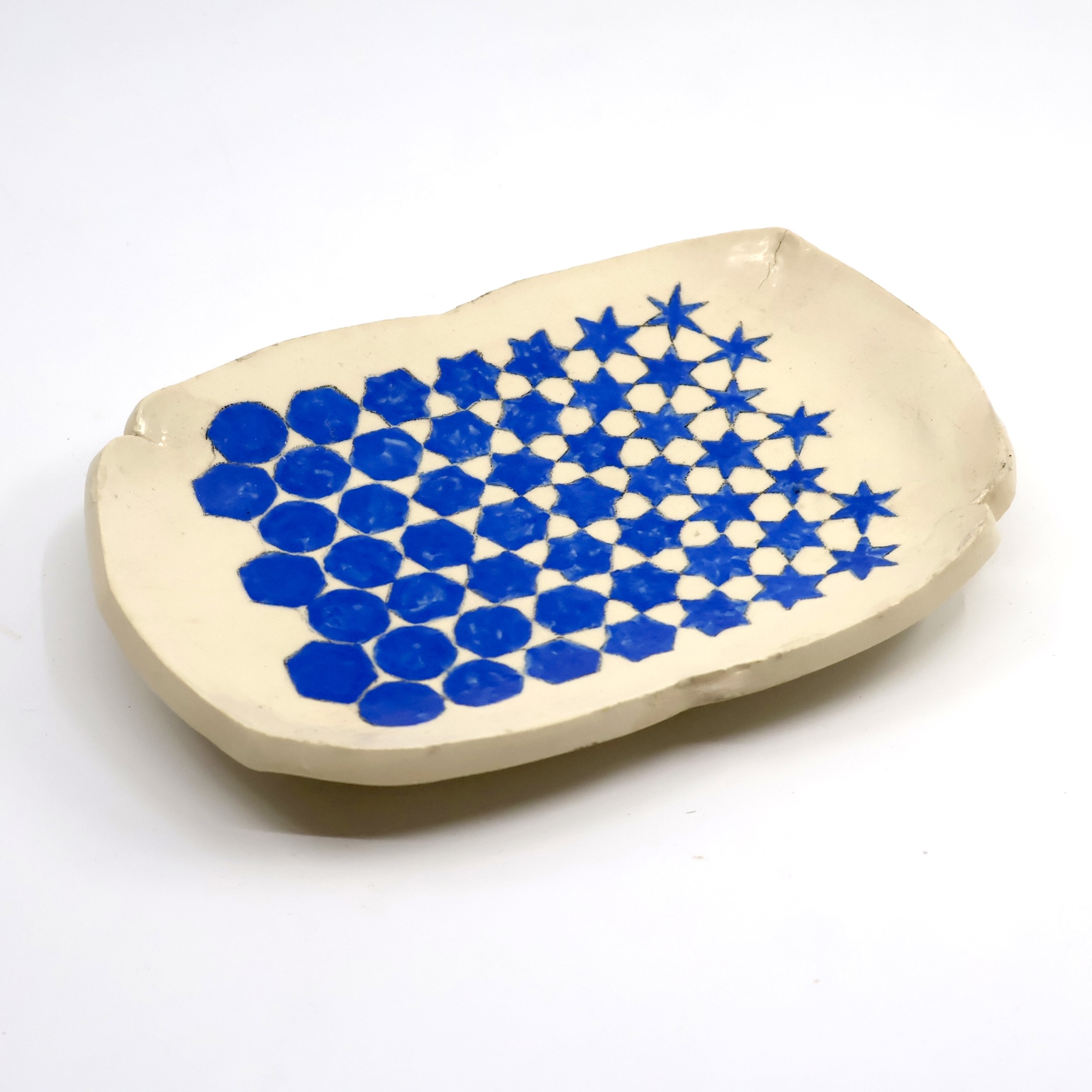 With this little tray I experimented with plotting a morphing pattern using an underglaze pencil, then I colored the patterns with blue underglaze. The corners cracked a bit so this is not a great example of a finished piece but it was an experiment in pattern making.