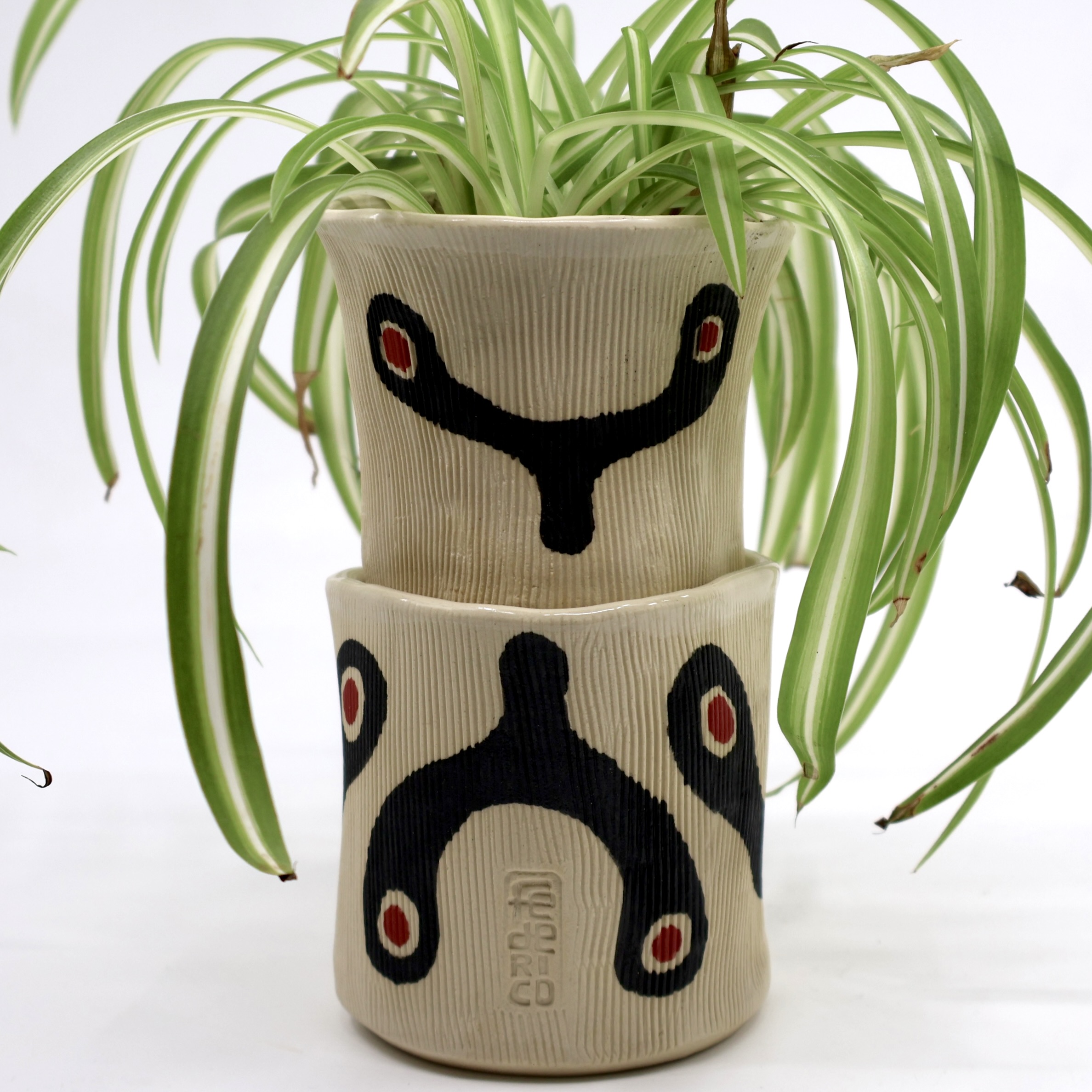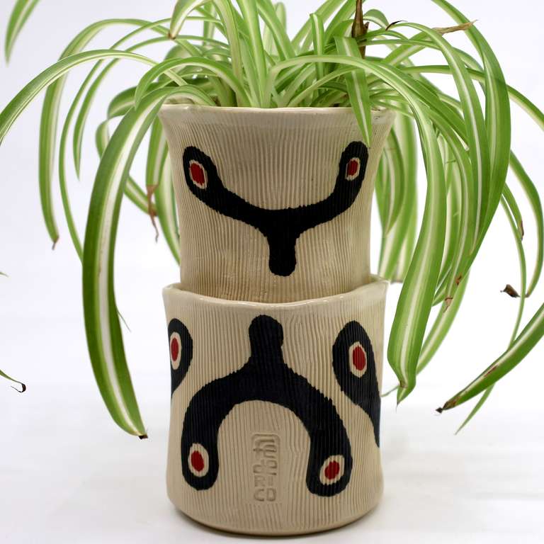 And a bigger one with similar black and red underglaze markings and carved texture.