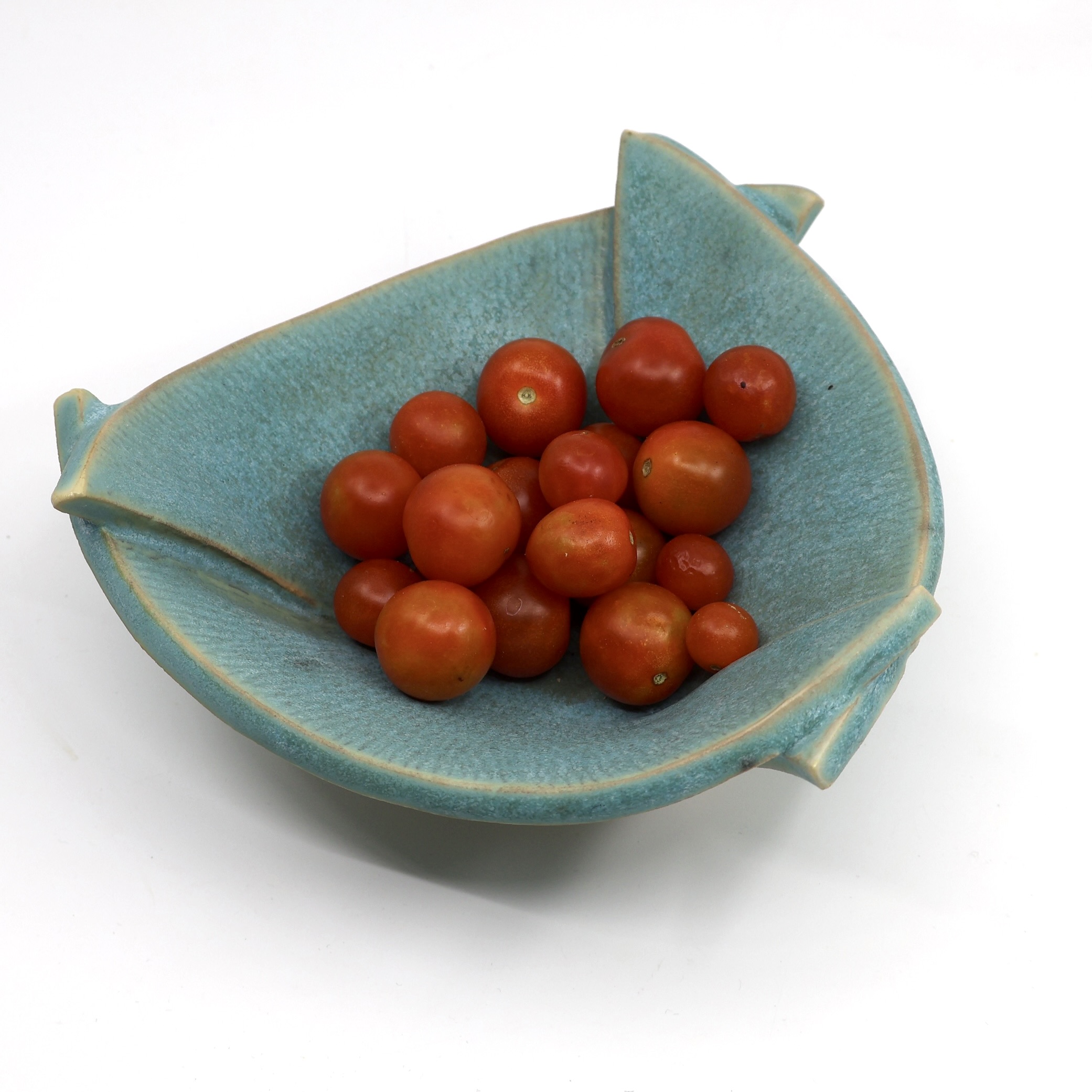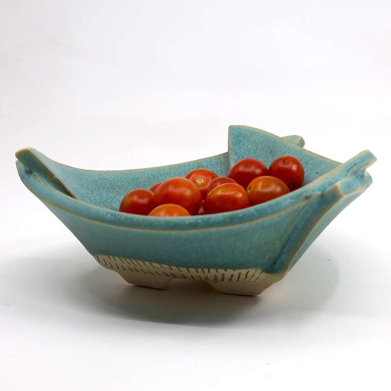 I like these forms made with a paper template and some folds. This one has a subtle underglaze texture that is almost obscured by the blue glaze.