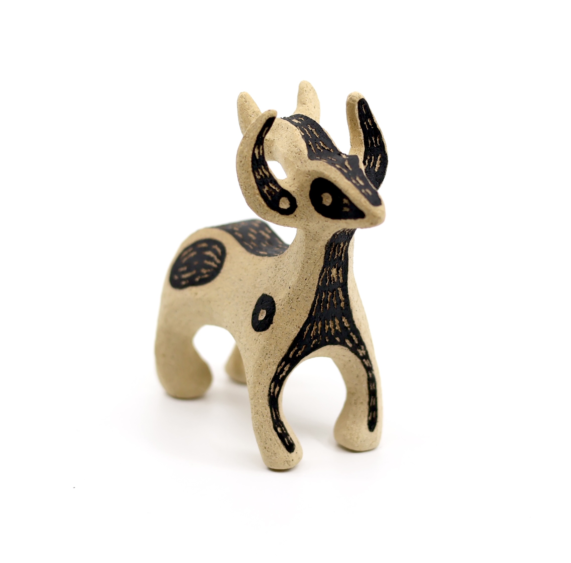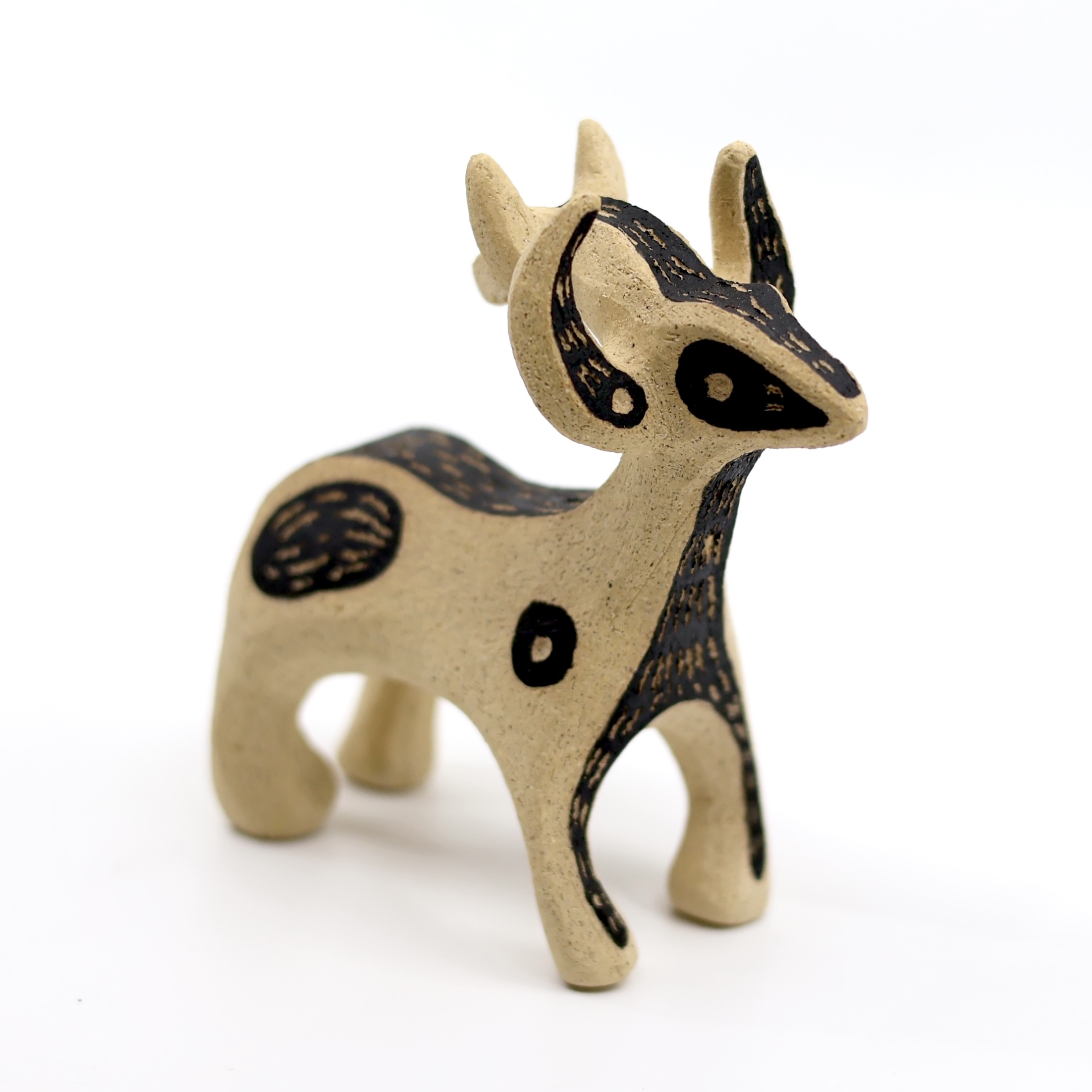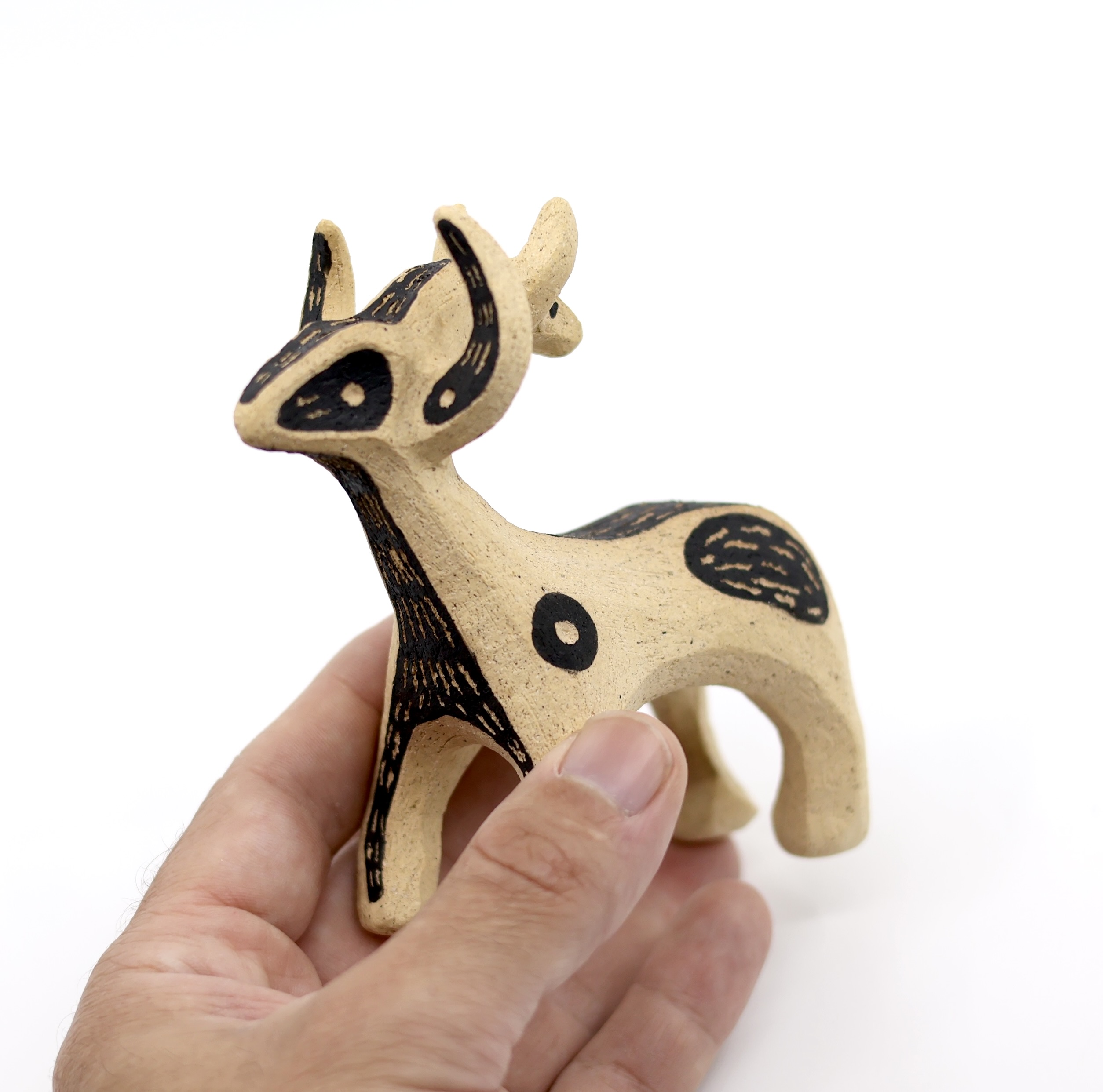 I discovered that I enjoy the process of carving the clay when it's leather hard to create these very faceted shapes. The deer creature was made with Laguna Clay 52 Buff w/Sand which is why the texture is a little rough. I painted it with Amaco black underglaze and scratched the lines.