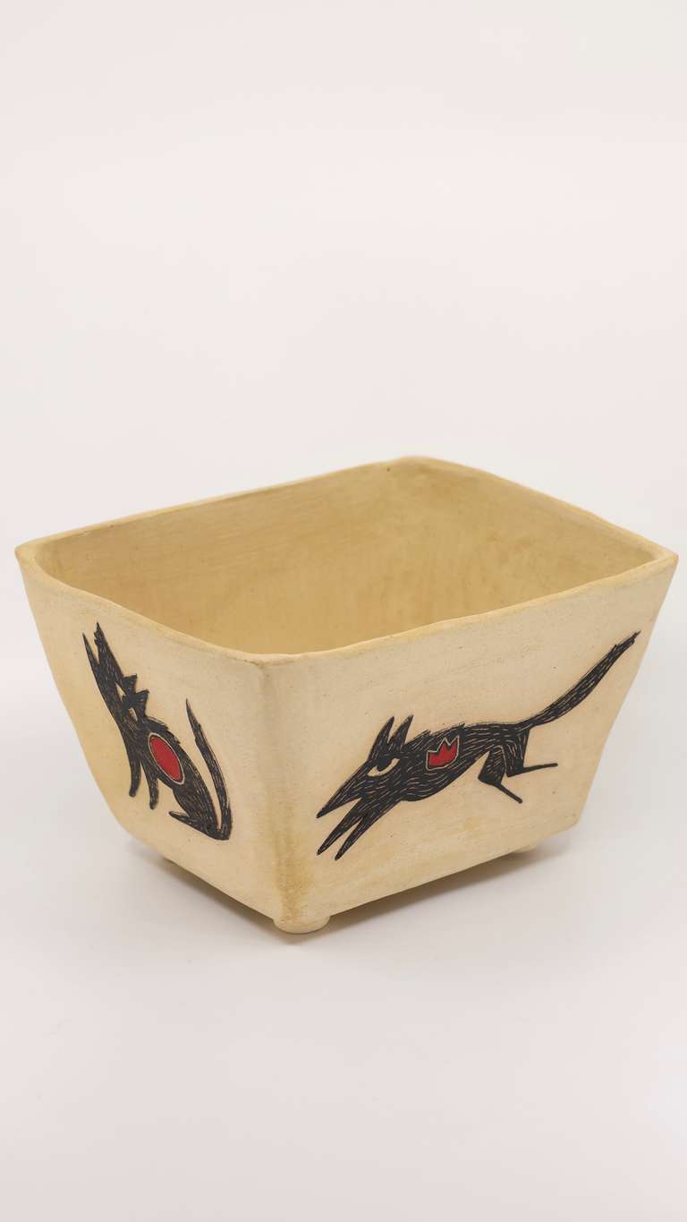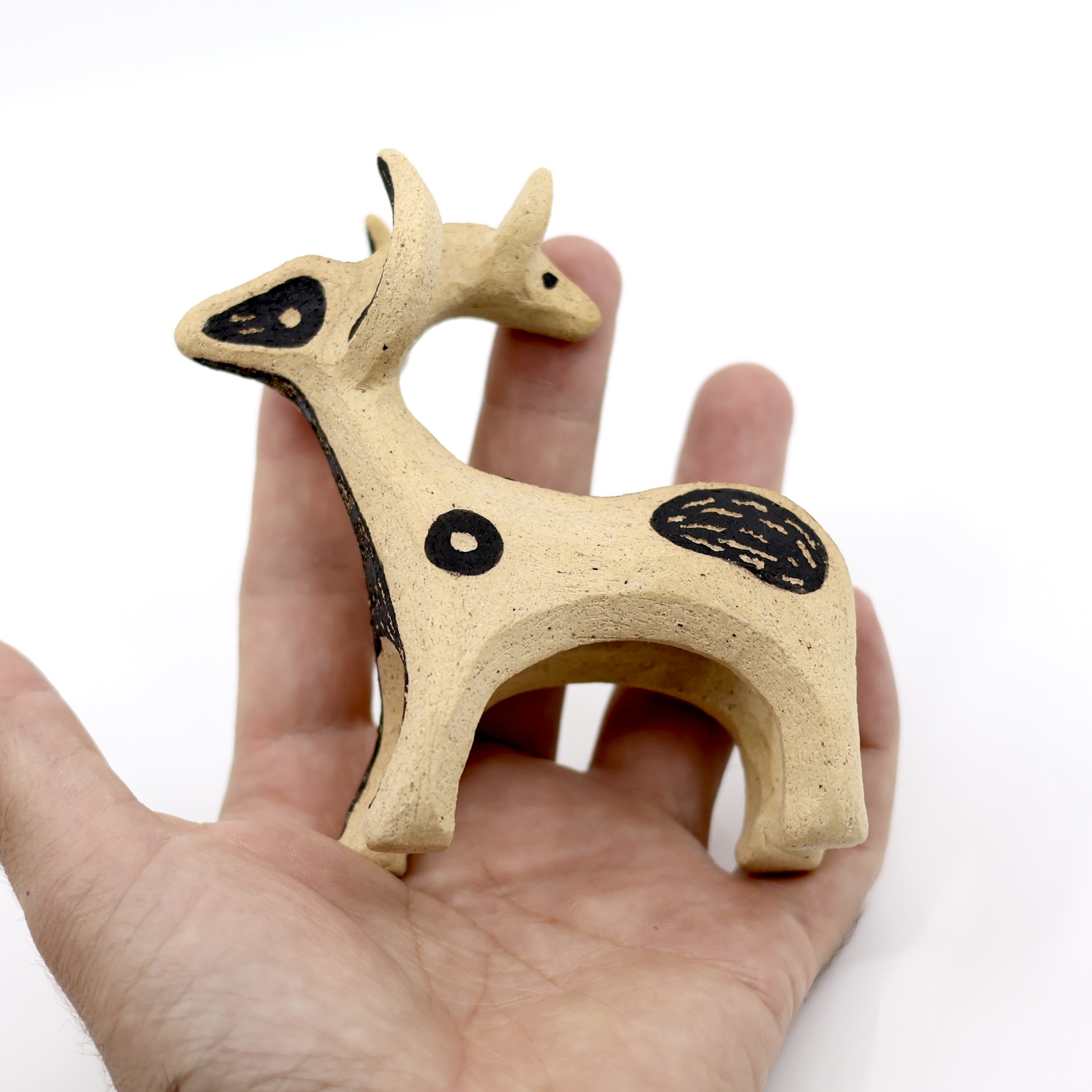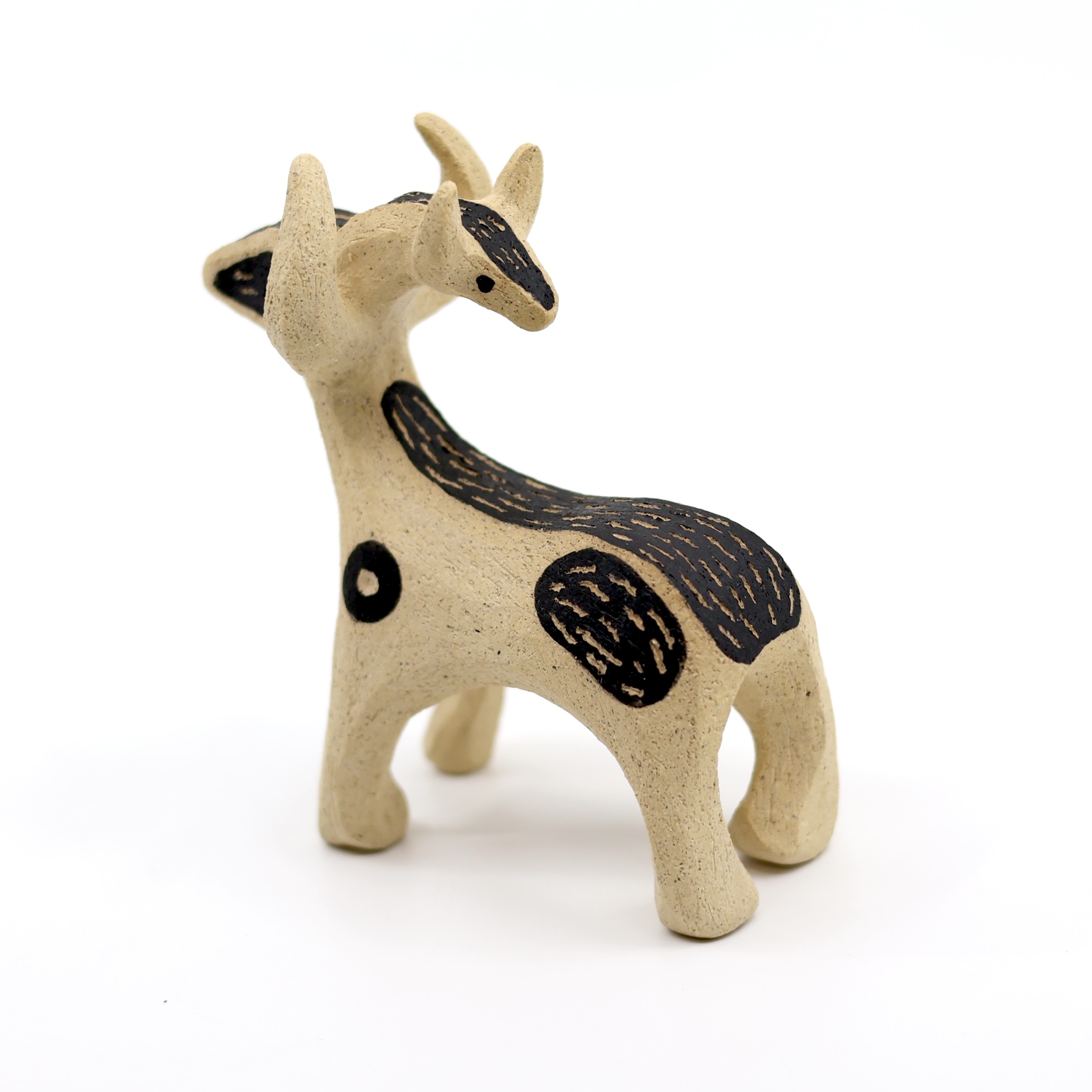 I discovered that I enjoy the process of carving the clay when it's leather hard to create these very faceted shapes. The deer creature was made with Laguna Clay 52 Buff w/Sand which is why the texture is a little rough. I painted it with Amaco black underglaze and scratched the lines.