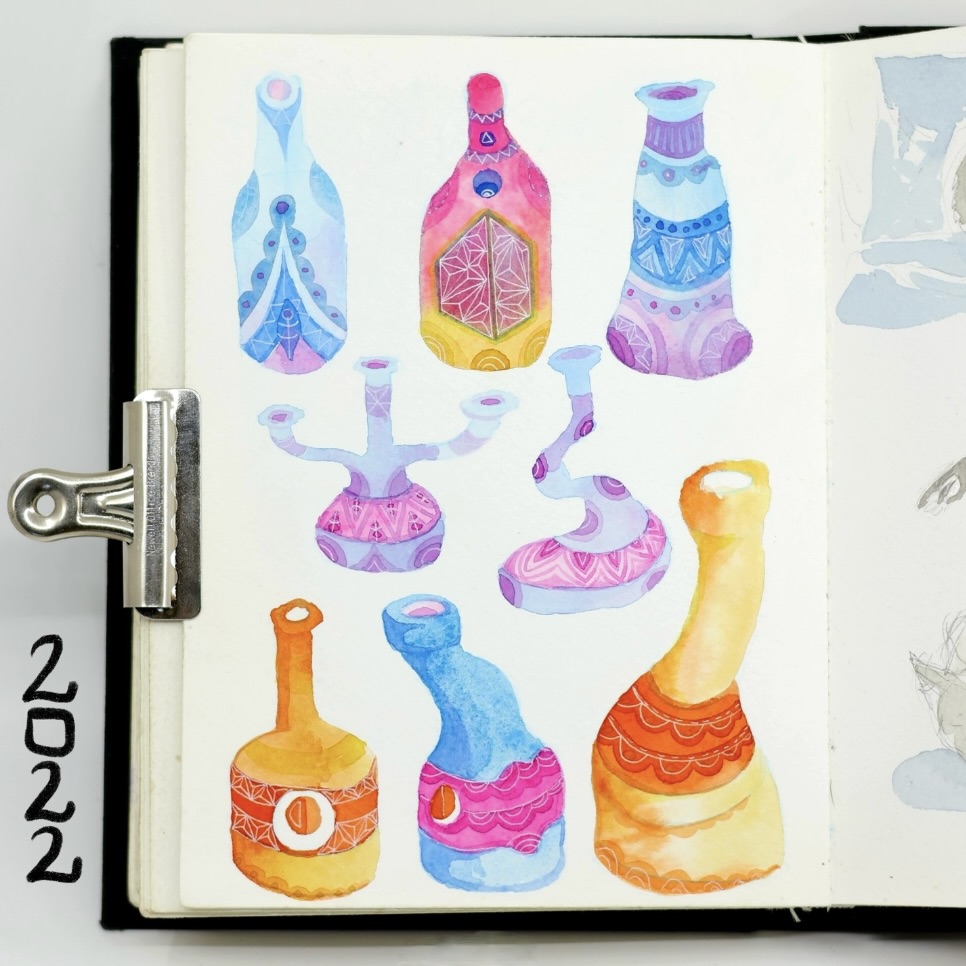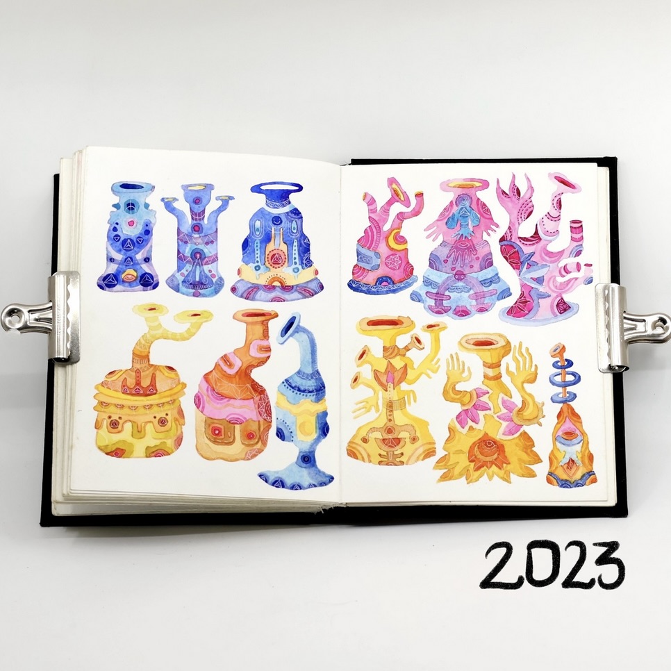 Creativiy works in mysterious ways. A couple of years ago I started drawing these "weird vessels" with no intention of turning them into objects. They started as just bottles and then began morphing into plant and mushroom-like things on the page.